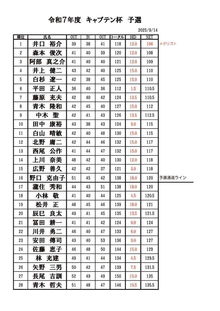 12 | 川井 勇二 | 116 | 41 | 41 | 42 | 124 | 6 | 118 | 234 | |