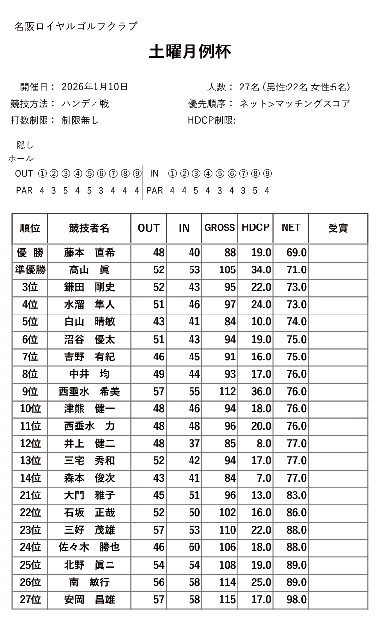 いつも名阪ロイヤルゴルフクラブをご愛護いただきまして、ありがとうございます。 2026年1月度に開催されました、土曜月例杯の競技結果を掲載しました。