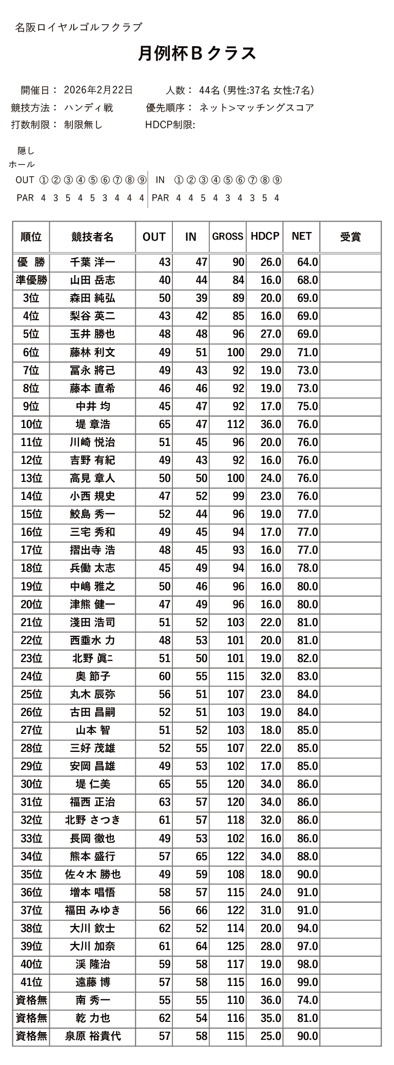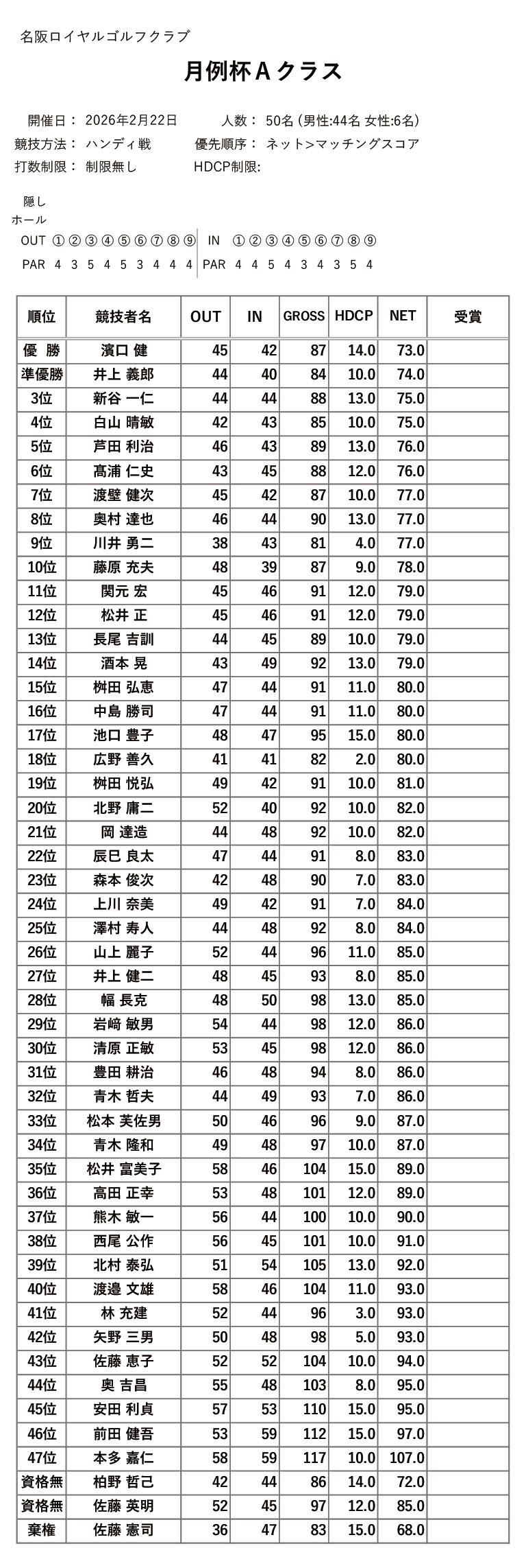 いつも名阪ロイヤルゴルフクラブをご愛護いただきまして、ありがとうございます。 2026年2月度に開催されました、月例杯A、月例杯Bの競技結果を掲載しました。