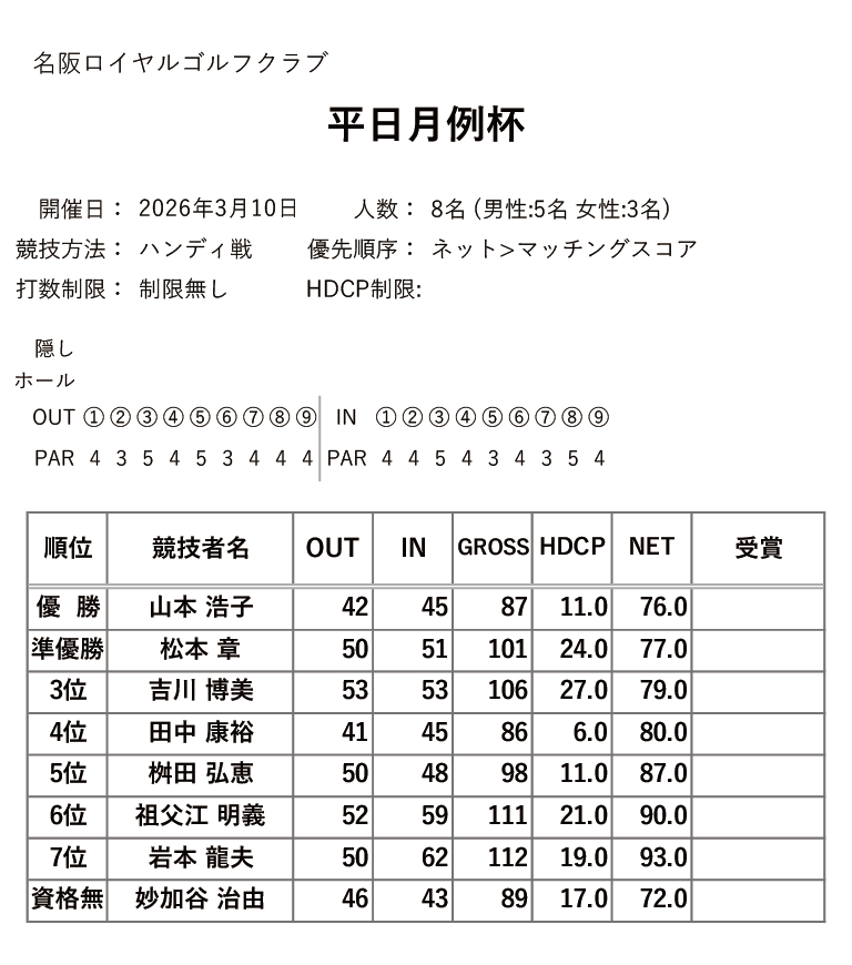 いつも名阪ロイヤルゴルフクラブをご愛護いただきまして、ありがとうございます。 2026年3月度に開催されました、平日月例杯の競技結果を掲載しました。